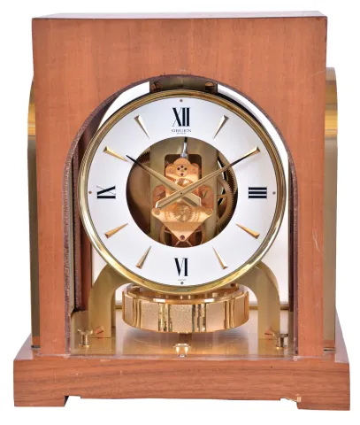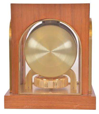 LeCoultre & Cie, Switzerland, for Gruen Guild / Cosmos Corp. "Atmos" clock, 15 jewel gilt caliber 528 movement, gilt torsion pendulum, round white painted dial with painted Roman numerals and gilt arrow markers, gilt hands with black tips, contained in a