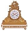 France, a marble and gilt bronze mantel clock, white marble base on gilt feet with recessed panels containing gilt, foliate ornament, the upper section with gilt, acanthus decorated scrolls supporting the cylindrical case, and surmounted by a trophy