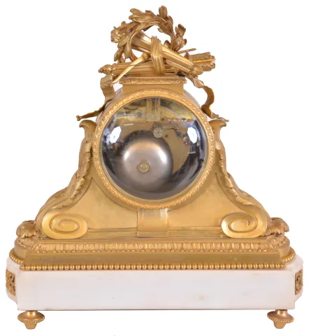 France, a marble and gilt bronze mantel clock, white marble base on gilt feet with recessed panels containing gilt, foliate ornament, the upper section with gilt, acanthus decorated scrolls supporting the cylindrical case, and surmounted by a trophy incorporating a bow, arrows, quiver, and torch, encircled by a laurel wreath, Roman numeral white enamel dial signed "Causard Her. Du Roy A Paris", gilt Louis XV style hands, 8 day time and strike pendule de Paris movement a bit dirty, marble with a few minor flakes and chips, gilding on cast components very good, minor scrapes on top of cylindrical surface of case, dial and hands very good, movement ticks and strikes