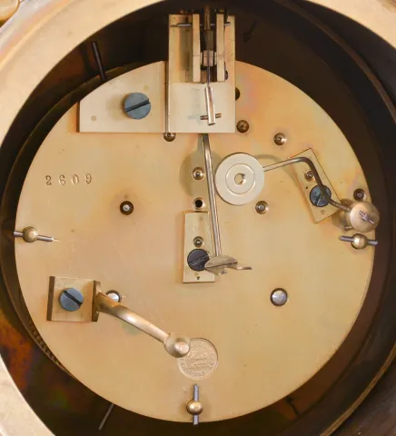 a bit dirty, marble with a few minor flakes and chips, gilding on cast components very good, minor scrapes on top of cylindrical surface of case, dial and hands very good, movement ticks and strikes