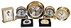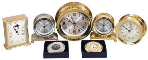 Clocks- 7 (Seven) Chelsea Clock Company metal case quartz movement clocks, new / old stock mostly in original factory packaging: two #20990 Brewster desk clocks in brass and nickel; #20892 "Moonphase in Brass" carriage clock with moon dial; #90886