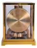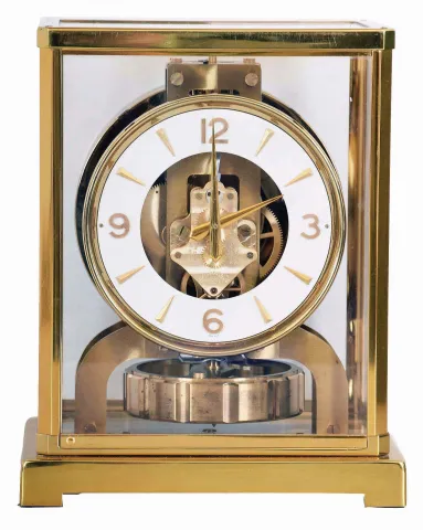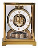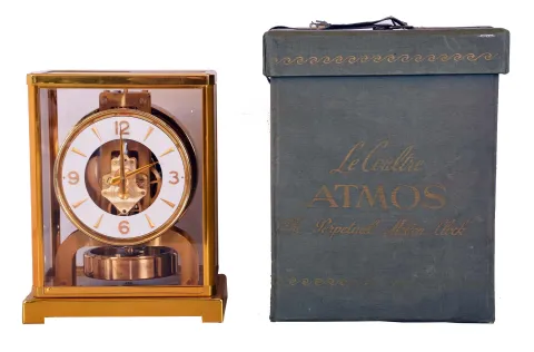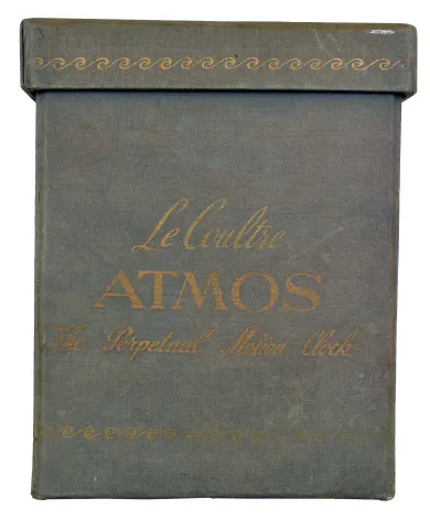 LeCoulture "Atmos" gilt brass and glass perpetual mantel clock, serial number 98063, front door hinges from side, in original green felt carrying box this case is in very good original condition with no dulling or losses on the gilding. The movement and dial are fine, and we viewed the escapement and hands advance although not tested long term