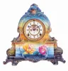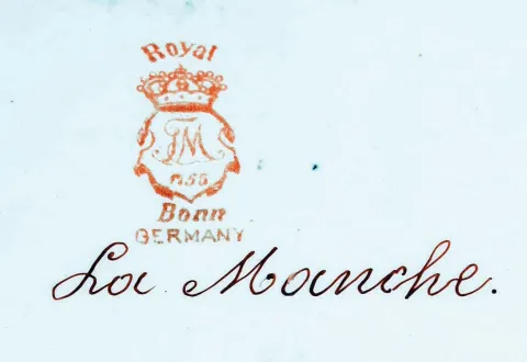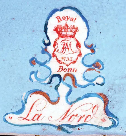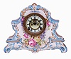 Clocks- 2 (Two): (1) Ansonia Clock Co., New York. "La Nord" shelf clock with an 8 days spring driven time and strike brass movement with visible escapement in a Royal Bonn porcelain case. (2) Ansonia Clock Co., New York. "La Manche" shelf clock with an 8 days spring driven time and strike brass movement with visible escapement in a Royal Bonn porcelain case. (1) The porcelain case is in excellent condition with no chips or cracks, There is some minor wear to the gilt areas on the lower part of the case. The porcelain dial is in excellent condition with no chips or hairline cracks. The hands are original. Ht. 11 5 / 8". (2) The porcelain case is in excellent condition with no chips or cracks. The colors are vibrant. There is some minor wear to the gilt areas on the lower part of the case. The porcelain dial has hairline cracks at 9 and 2. The hands are original. Ht. 13 7 / 8".