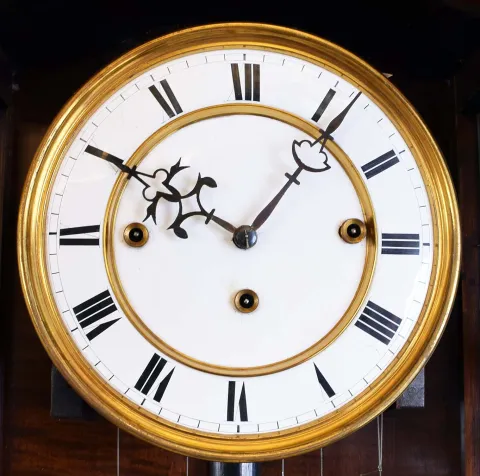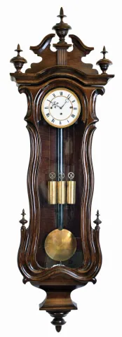 Vienna Regulator unsigned 8 day 3 weight quarter striking walnut wall clock this large ornate wall clock has a glossy finish with no major losses but age splits at the door's top and bottom. The glasses are fine, the brass weights and pendulum have an old patina, and the white enamel dial has just two minor cracks at the center. The complex movement appears complete but was not tested and is sold as is