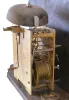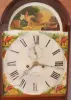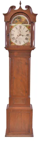 Pitt, Cetbury, England tall clock, 8 day, time and bell strike, weight driven movement in a mahogany case with broken arch top and painted iron dial depicting a hunting scene in arch with pheasant spandrels