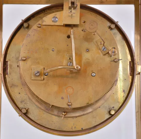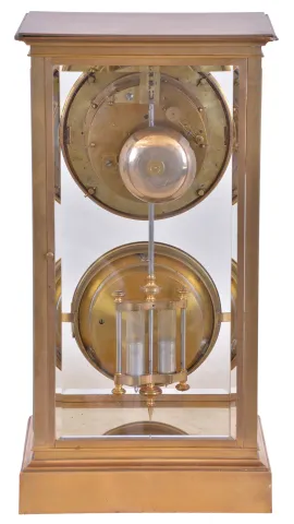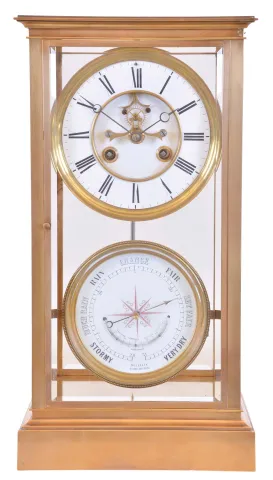 France, a large crystal regulator with barometer, gilt brass case with beveled glasses, Roman numeral white enamel dial with with exposed Brocot escapement and blued steel Breguet style hands, barometer also with enamel dial, 8 day time and strike pendule de Paris movement with two vial mercury pendulum case with minor tarnish, case top oxidized, rear corners of top with bends, glasses good, dial with hairlines, chip at 12:00, and repairs, hands with minor oxide, pendulum good, ticks and strikes, escapement needs adjustment, barometer added