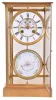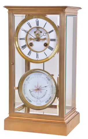 France, a large crystal regulator with barometer, gilt brass case with beveled glasses, Roman numeral white enamel dial with with exposed Brocot escapement and blued steel Breguet style hands, barometer also with enamel dial, 8 day time and strike pendule
