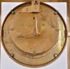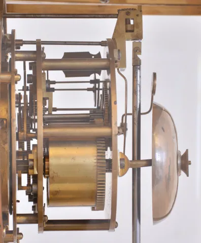 case with minor tarnish, case top oxidized, rear corners of top with bends, glasses good, dial with hairlines, chip at 12:00, and repairs, hands with minor oxide, pendulum good, ticks and strikes, escapement needs adjustment, barometer added