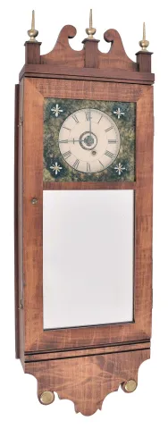 Beautifully made copy in miniature of a New Hampshire mirror clock in a dark stained figured maple. Case houses a miniature weight brass movement and separate weight alarm movement. This timepiece is in excellent condition.