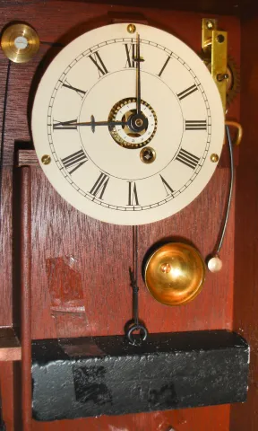 Michael Paul, Berea, Ohio, 30 hour, weight brass movement with weight alarm miniature timepiece copy of a New Hampshire mirror clock. This example is number 9 of 15.