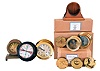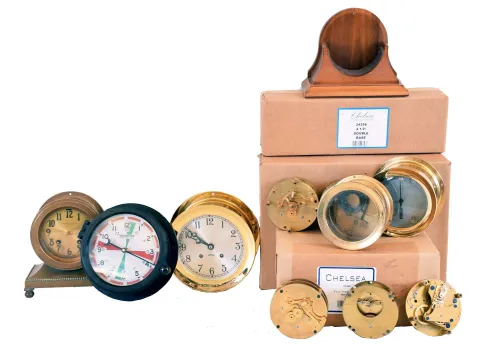 Clocks and Parts, Chelsea Clock Company: 5 movements, 3 ship's bells, 2 time only; Timemaster quartz radio room in black phenolic case; "Library" with applied bronze numbers; 6 inch ship's bells with missing balance platform; 4 wood stands; quartz movement ship's bells with no dial or hands; case only for 4 inch ship's bells movement large lot of good Chelsea material for restoration and parts. The rare "Library" model is a bonus. Sold as is, no further details available.