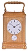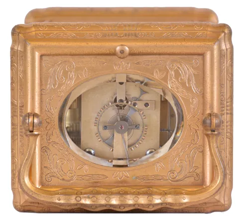 France, hour repeating carriage clock, engraved, gilt Gorge case with beveled glasses, the back door also with engraving and shuttered apertures for winding and setting, white enamel dial with gilt, engraved mask, blued steel Breguet style hands, 8 day time and strike and alarm movement with lever platform, repeating the hours on demand gilding dirty and with minor losses, glasses good, hands and dial good, movement dirty, oily, functions correctly, low balance amplitude, needs service