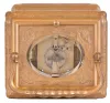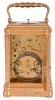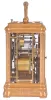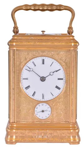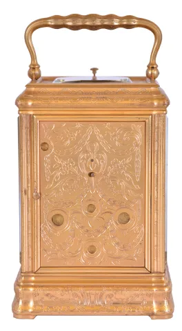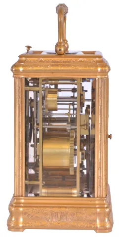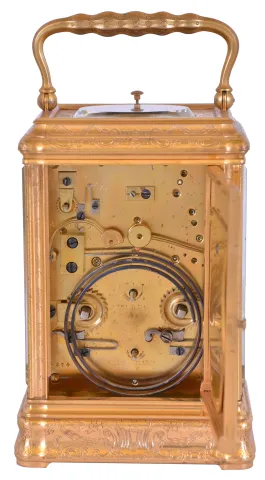 France, hour repeating carriage clock, engraved, gilt Gorge case with beveled glasses, the back door also with engraving and shuttered apertures for winding and setting, white enamel dial with gilt, engraved mask, blued steel Breguet style hands, 8 day