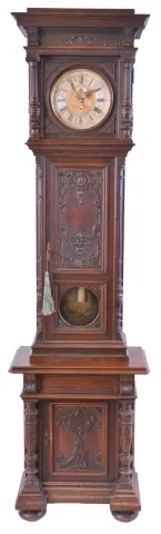 V. Postpischil, Vienna, Austria, long duration tall clock, 30 day, time only, weight driven movement in a carved walnut case with glazed window for engraved pendulum bob, bun feet and cabinet in base. The brass dial has silvered chapter ring is signed by maker and engraved center with matching engraved weight. the case retains its original finish with minor nicks and scuffs. The dial's chapter ring could use resilvering, pendulum and weights are in very good condition.