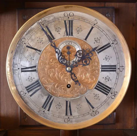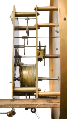 the case retains its original finish with minor nicks and scuffs. The dial's chapter ring could use resilvering, pendulum and weights are in very good condition.