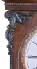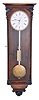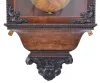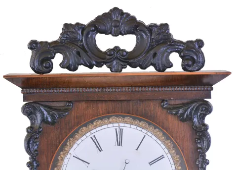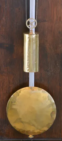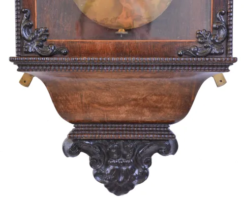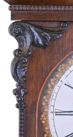 case in an old finish, veneer with some fading and minor blisters, ornaments re-painted black, dial with touch ups and chips at winding hole, movement ticks, pendulum rod with minor pitting, now painted brightly, pendulum with minor wrinkles, weight with dents, key with split handle.