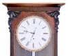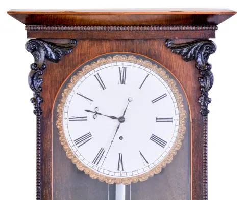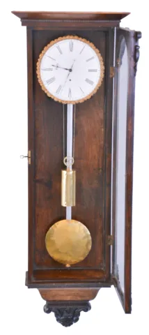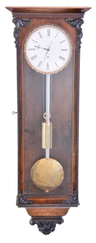 Austria, month going regulator in the Biedermeier style, rosewood veneered case with contrasting fine banding and beveled cornice molding, ripple moldings and applied, cast ornaments, one piece Roman numeral enamel dial with well cast & gilt bezel, finely cut blued steel hands, 30 day timepiece movement, brass pendulum with steel rod, and brass weight case in an old finish, veneer with some fading and minor blisters, ornaments re-painted black, dial with touch ups and chips at winding hole, movement ticks, pendulum rod with minor pitting, now painted brightly, pendulum with minor wrinkles, weight with dents, key with split handle.