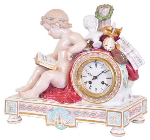 France, Figural mantel clock, Meissen porcelain case with a seated putto, bust, wreath, mandolin, palette, and other items symbolizing the arts, Roman numeral white enamel dial, blued steel hands, 8 day time and strike pendule a Paris movement with silk
