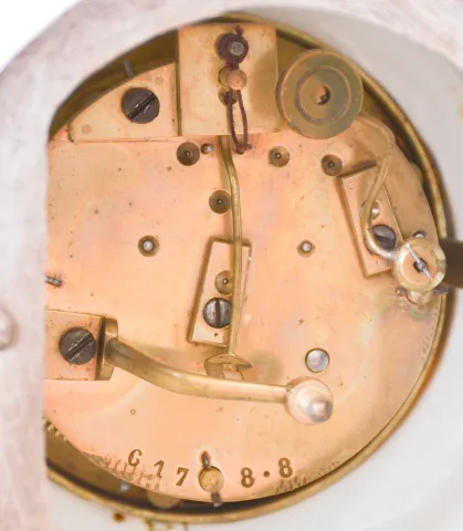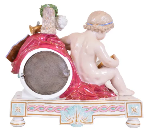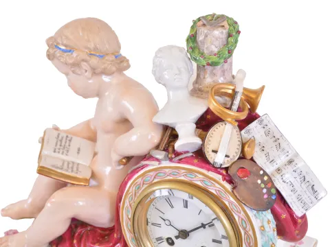 France, Figural mantel clock, Meissen porcelain case with a seated putto, bust, wreath, mandolin, palette, and other items symbolizing the arts, Roman numeral white enamel dial, blued steel hands, 8 day time and strike pendule a Paris movement with silk thread suspension, bottom of case with crossed swords mark case with minor losses and repairs, dial with repaired chips, minute hand replaced, movement not working, needs service, pendulum missing, rear door replaced