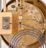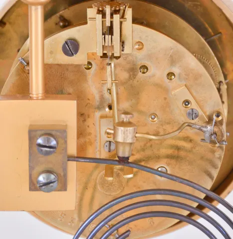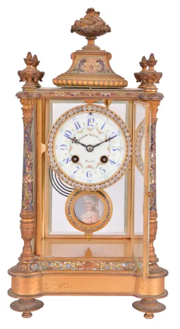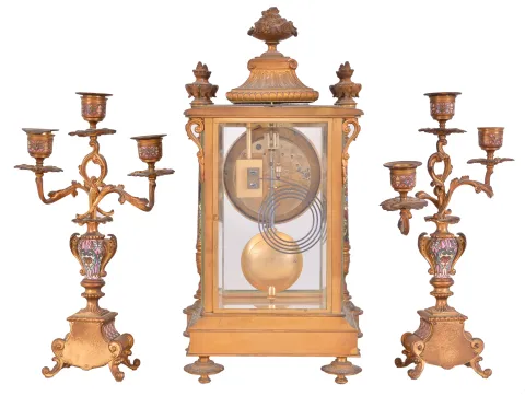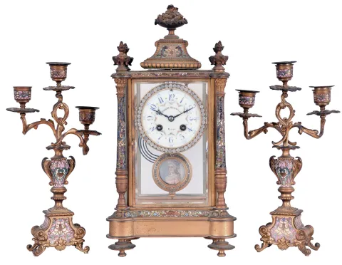 France, for Bigelow, Kennard, & Co., 3 piece mantel garniture, ornate gilt and champleve enamel crystal regulator, Arabic numeral numeral enamel dial with floral garlands, blued steel hands, and brilliant set bezel, 8 day time and strike pendule de Paris movement, gilt, brilliant set pendulum with signed portrait of a young woman, the side pieces each holding three candles, and with gilt and champleve enamel ornamented surfaces all pieces very dirty, top of clock with gap, loose, dial good, hands with minor oxide, left side glass with minor chip, lower left, ticks and strikes, hammer boss with solder, pendulum portrait loose, candelabra with bends, also very dirty, one bobeche missing