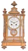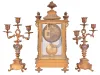 all pieces very dirty, top of clock with gap, loose, dial good, hands with minor oxide, left side glass with minor chip, lower left, ticks and strikes, hammer boss with solder, pendulum portrait loose, candelabra with bends, also very dirty, one bobeche missing