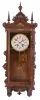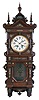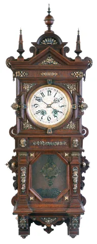Lenzkirch, Germany, wall clock, the oak case richly ornamented with carving, moldings, and applied, cast brass elements, case top with central sphere and flanking obelisk finials, Arabic numeral silvered dial, blued steel hands, two train, 8 day quarter