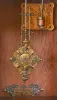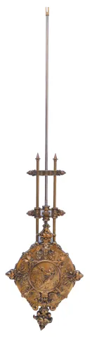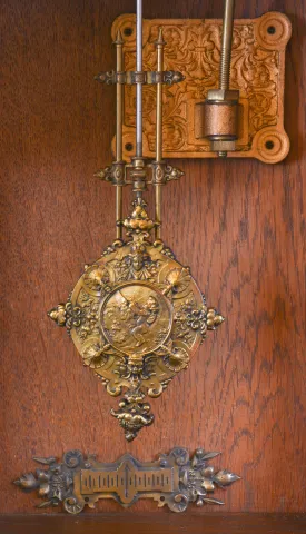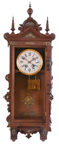 Lenzkirch, Germany, wall clock, the oak case richly ornamented with carving, moldings, and applied, cast brass elements, case top with central sphere and flanking obelisk finials, Arabic numeral silvered dial, blued steel hands, two train, 8 day quarter striking movement chiming on two gongs, fancy cast pendulum, serial #865517 case in an old finish, and in very good condition overall, cast ornaments with some darkening, tarnish, dial with minor scratches, and verdigris staining around winding holes, hands good, ticks and strikes