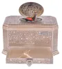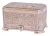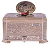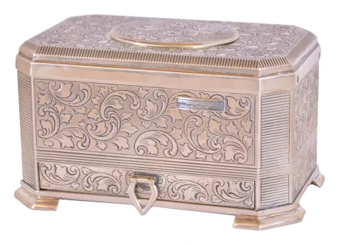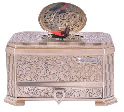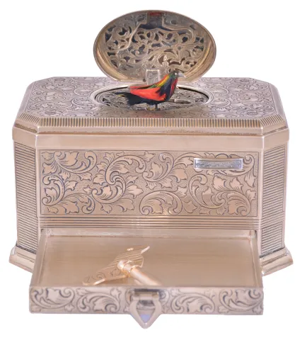 Mechanische Musikwerke Manufaktur, (MMM), Germany, singing bird box, the foliate engraved sterling silver case with canted corners, and a small drawer in the base, top with oval cover concealing a bird with brightly colored feathers, appearing and
