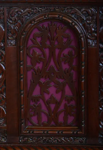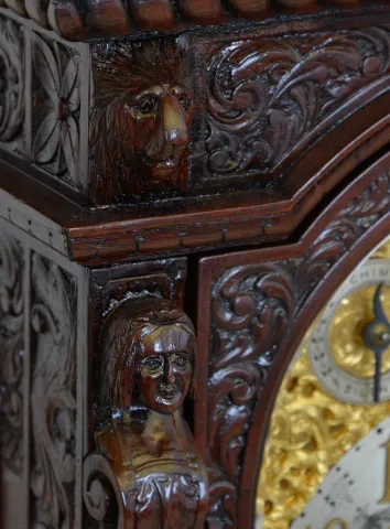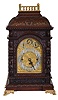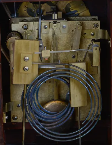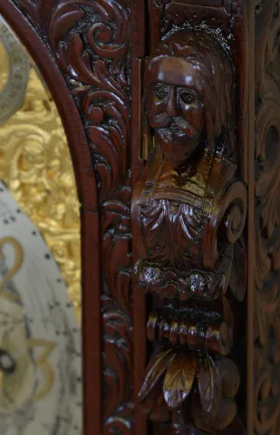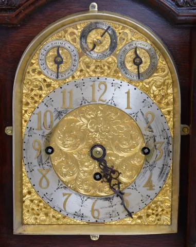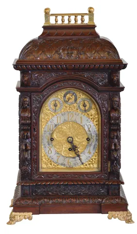 England, unsigned large, three train chiming bracket clock, mahogany case richly ornamented with low and high relief carving, with brass balustrade at top, and resting on gilt paw feet, door with beveled glass, composite dial with Arabic numeral chapter ring, dial plate with engraved center, gilt spandrels, and with rating and chime selection dials in the arch, blued steel hands, substantial 8 day, three train fusee movement chiming on four gongs or eight bells at the quarters, the fourth quarter also with hour striking on a large gong case refinished, door glass replaced, silvered dial components with minor losses and tarnish, hour hand with file marks at boss, movement ticks, strikes, and chimes, pendulum tie down missing, gongs with spotty oxidation