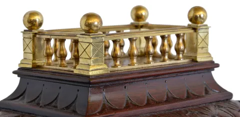 England, unsigned large, three train chiming bracket clock, mahogany case richly ornamented with low and high relief carving, with brass balustrade at top, and resting on gilt paw feet, door with beveled glass, composite dial with Arabic numeral chapter