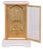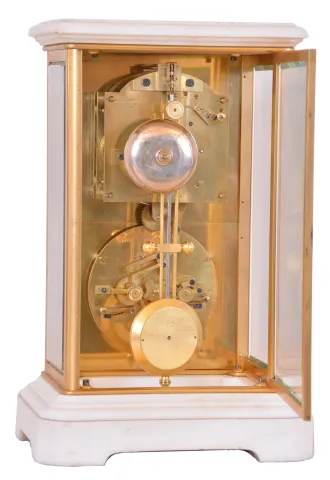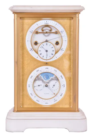 Brocot & Delettrez, Paris, for J. Silvani, 13 & 14 Kings Road, Brighton, mantel clock with sweep seconds and Brocots perpetual calendar, the case with four bevelled glasses set in gilt bronze frames, with white marble base and top, gilt dial mask with foliate engraving, the white enamel clock dial with Arabic seconds, open escapement, and subsidiary dial showing the hours and minutes, and lower calendar dial displaying the day, date, and month, as well as phases of the moon, 8 day time and strike movement with sweep seconds, jewelled escape wheel pivot and Ellicott pendulum, the back marked "J.B.D" marble with minor flakes and chips, rear glass with minor chip at lower right, gilt frames good, with minor dirt and losses, dial mask with very good gilding, dial center with small fracture above right winding arbor, escape wheel jewel cracked, seconds hand with bends, minute hand replaced, date hand replaced, movement ticks and strikes, calendar working, pendulum good