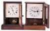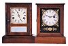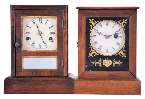 Clocks- 2 (Two): (1) Seth Thomas Clock Co., Thomaston, Conn., cottage clock with a spring driven 30 hour time and strike movement in a rosewood veneered case, c1875; (2) Unidentified American cottage clock with a spring driven 30 hour timepiece movement