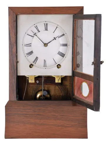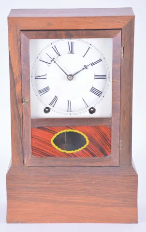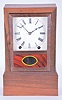 Clocks- 2 (Two): (1) American kitchen clock, time, strike and alarm weight driven movement with reverse painted tablet; (2) Bradley Manf'g. Co., Southington, Conn. cottage clock with a spring driven, 8 day, time and strike movement in a rosewood veneered case, c1855. (1) the original dial has some touchup and the tablet is repainted. (2) The case has been refinished and has minor veneer loss along the base. The painted dial has had restoration and now shows loss at the winding holes. The hands are replaced. The upper and lower door glasses are original. The lower glass has been redone with black paint. Note: both clocks have the same dimensions.
