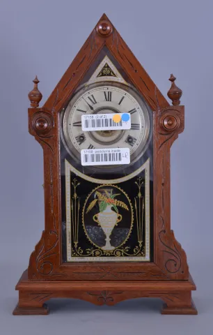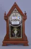 Clocks- 2 (Two): (1) American kitchen clock, time, strike and alarm weight driven movement with reverse painted tablet; (2) Bradley Manf'g. Co., Southington, Conn. cottage clock with a spring driven, 8 day, time and strike movement in a rosewood veneered