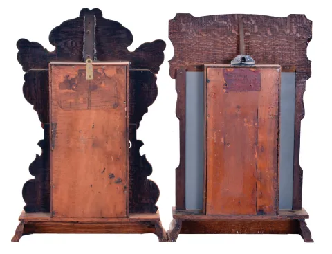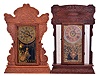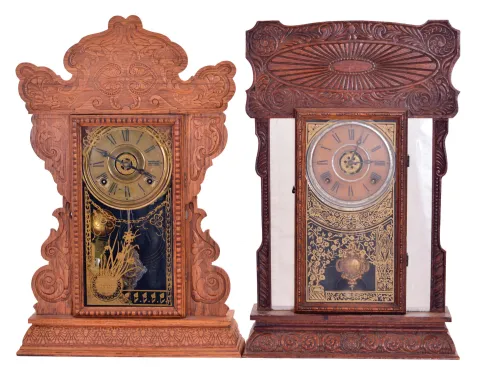 (1) Refinished pressed oak case in nice condition except for the piece that holds the dial plate. There are cracks and damaged areas from the extra holes that have been drilled in the dial pan. The original dial paper has age darkened along with discolored areas and surface abrasion. Original hands, tablet and pendulum. Partial label on the back; (2) Pressed oak case in an old and possibly original finish. Original paper dial has stains and has age darkened. There is scattered wear to the nickel plating on the dial pan. The tablet appears replaced. Original hands and pendulum. Partial label on the back. Measurement is for the largest clock.