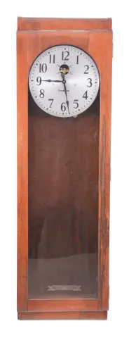 the clock does not have a pendulum, otherwise it is in good condition with some veneer lifting on lower back board.