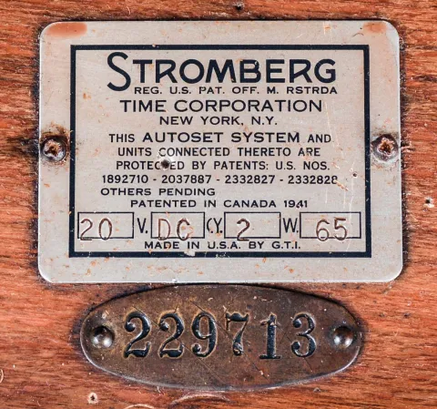 Stromberg Time Corporation, New York, NY, electric master regulator wall clock, time only movement marked "6957M" with deadbeat escapement in a mahogany case with silvered metal dial, patent date 1941 the clock does not have a pendulum, otherwise it is in good condition with some veneer lifting on lower back board.