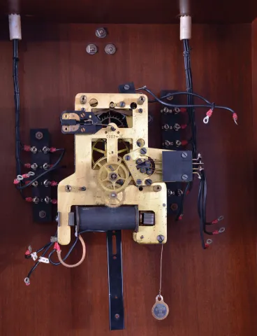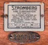 Stromberg Time Corporation, New York, NY, electric master regulator wall clock, time only movement marked "6957M" with deadbeat escapement in a mahogany case with silvered metal dial, patent date 1941