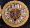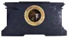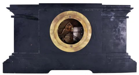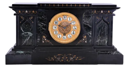 Boston Clock Co., Boston Mass., black mantel clock, 8 day, time and strike with single arbor tandem wind in a black slate case with green marble accents and fancy dial with raised cartouche numerals, c1895. This clock is in nice condition except for a crack on the upper left side. The handsome dark green and white marble accents, beveled glass, and dial are in nice shape. The hands are original. The back door is missing. The signed movement is stamped with serial number "B 6280". The movement winds, ticks and strikes, but was not tested long term.