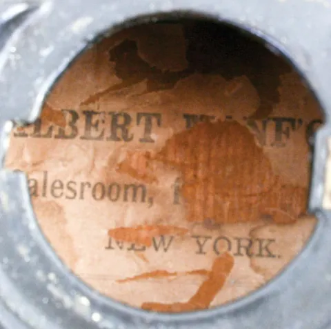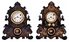 Clocks- 2 (Two): (1) Gilbert Mfg. Co., New York, shelf clock with a spring driven 30 hour timepiece movement in a cast iron case with gilt and painted design, c1860; (2) Unidentified shelf clock with a spring driven 30 hour timepiece movement in a cast iron case with gilt and painted design, c1860. (1) The case front design is still in good condition. The dial may be a replacement. The hands are original. The bezel glasses are original; (2) The case front gilt and painted design are still quite strong and in nice condition. The case is stamped "PCF" on the back side. The dial bezel glass is missing. The hands are original. The paper dial shows wear. Note: Both clocks have the same dimensions.