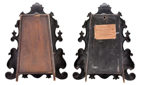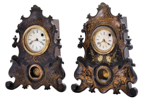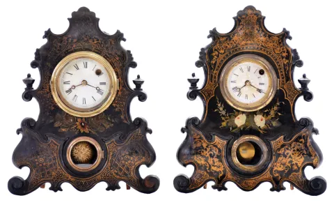 (1) The case front design is still in good condition. The dial may be a replacement. The hands are original. The bezel glasses are original; (2) The case front gilt and painted design are still quite strong and in nice condition. The case is stamped "PCF" on the back side. The dial bezel glass is missing. The hands are original. The paper dial shows wear. Note: Both clocks have the same dimensions.