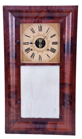 Refinished mahogany veneered case has some veneer loss on the bottom edge, center cross strip, upper left corner and the lower right side. Wood dial has been repainted. Original mirror and hands. Clean label inside.