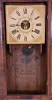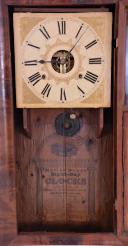 Birge, Mallory & Co., Bristol, Conn., large 8 day, time and strike weight strap brass movement OG shelf clock. Refinished mahogany veneered case has some veneer loss on the bottom edge, center cross strip, upper left corner and the lower right side. Wood dial has been repainted. Original mirror and hands. Clean label inside.