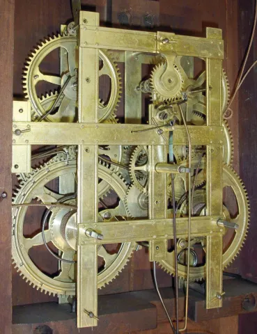 Birge, Mallory & Co., Bristol, Conn., large 8 day, time and strike weight strap brass movement OG shelf clock.