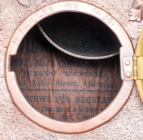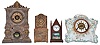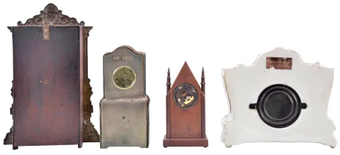 (1) The plated metal case shows reliefs of Wagner and Beethoven. The dial and hands are in nice condition; (2) The two rear finials are missing. The porcelain dial has several cracks; (3) The case has been repainted. The original paper dial shows some wear and has age darkened, The hands are original. The case is signed "N. Muller, NY. No. 30"; (4) The case is in nice condition with no chips or cracks. The dial and hands are original. The movement is a Seth Thomas No. 89 Eclipse. Note: THe dimensions are for clock; (3) .
