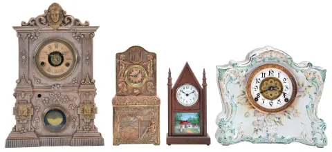 Clocks- 4 (Four): (1) Unidentified maker novelty cast metal case clock with 30 hour backwind timepiece movement, c1900; (2) Miniature steeple clock by Fynetone Co., Lansdale, PA; (3) American Clock Co.,, 3 Cortlandt St., NY, "Lion Head" model shelf clock with a spring driven 30 hour time, strike and alarm movement in a spelter case (no. 30) by Nicholas Muller, c1870; (4) F. Kroeber, New York, "China No. 20" shelf clock with a spring driven, 8 day, time and strike movement in a china case, c1898. (1) The plated metal case shows reliefs of Wagner and Beethoven. The dial and hands are in nice condition; (2) The two rear finials are missing. The porcelain dial has several cracks; (3) The case has been repainted. The original paper dial shows some wear and has age darkened, The hands are original. The case is signed "N. Muller, NY. No. 30"; (4) The case is in nice condition with no chips or cracks. The dial and hands are original. The movement is a Seth Thomas No. 89 Eclipse. Note: THe dimensions are for clock; (3) .