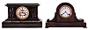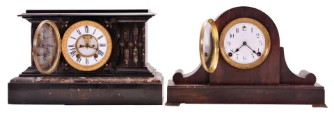 Clocks- 2 (Two): (1) Ansonia Clock Co., New York, unidentified shelf clock with a spring driven, 8 day, time and strike, (rack and snail) movement with visible escapement in a marble case, c1904; (2) Sessions Clock Co., Forestville, Conn., "Dawson" tambour mantel clock with a spring driven, 8 day time and half hour strike movement in a mahogany finished case, c1914. (1) The marble case is in good condition with minor repair to the top molding on the left hand side. A fair amount of the gilt inlay remains. The porcelain dial is in very good condition with no hairline cracks. The hands are original. The rear door of the case is loose; (2) The case has its original finish. The porcelain dial is in very good condition with no hairline cracks. The hands are original. Note: The dimensions are for clock number (1) .