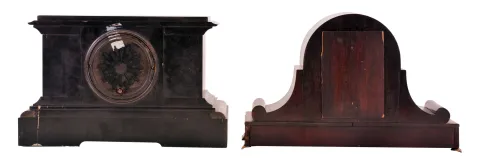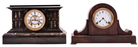 (1) The marble case is in good condition with minor repair to the top molding on the left hand side. A fair amount of the gilt inlay remains. The porcelain dial is in very good condition with no hairline cracks. The hands are original. The rear door of the case is loose; (2) The case has its original finish. The porcelain dial is in very good condition with no hairline cracks. The hands are original. Note: The dimensions are for clock number (1) .