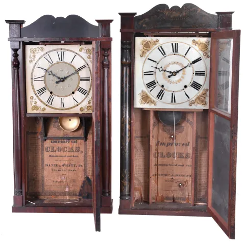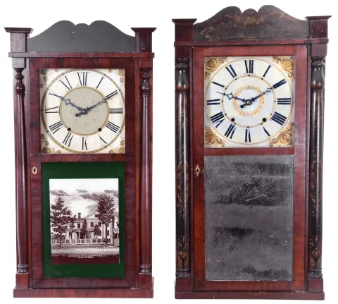 Clocks- 2 (Two): (1) Jeromes & Darrow, Bristol, Conn., 30 hour, time and strike weight wood movement half column & splat shelf clock, c1830; (2) Daniel Pratt, Jr., Reading, Mass., 30 hour, time and strike weight wood movement half clock and splat shelf clock, c1838 (1) Mahogany veneered case in an old finish has some repairs on the door and a repair to the right chimney. Original stenciling on the columns and splat. Mirror is old, but a replacement. Dial has been poorly restored. Key escutcheon replaced; (2) Refinished mahogany veneered case has had a lot of restoration. Large part of the door has new veneer. The dial has been poorly repainted. Tablet is modern. New weights. Chimneys are damaged and the splat is fiberboard.