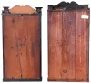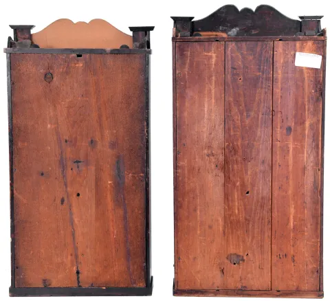(1) Mahogany veneered case in an old finish has some repairs on the door and a repair to the right chimney. Original stenciling on the columns and splat. Mirror is old, but a replacement. Dial has been poorly restored. Key escutcheon replaced; (2) Refinished mahogany veneered case has had a lot of restoration. Large part of the door has new veneer. The dial has been poorly repainted. Tablet is modern. New weights. Chimneys are damaged and the splat is fiberboard.